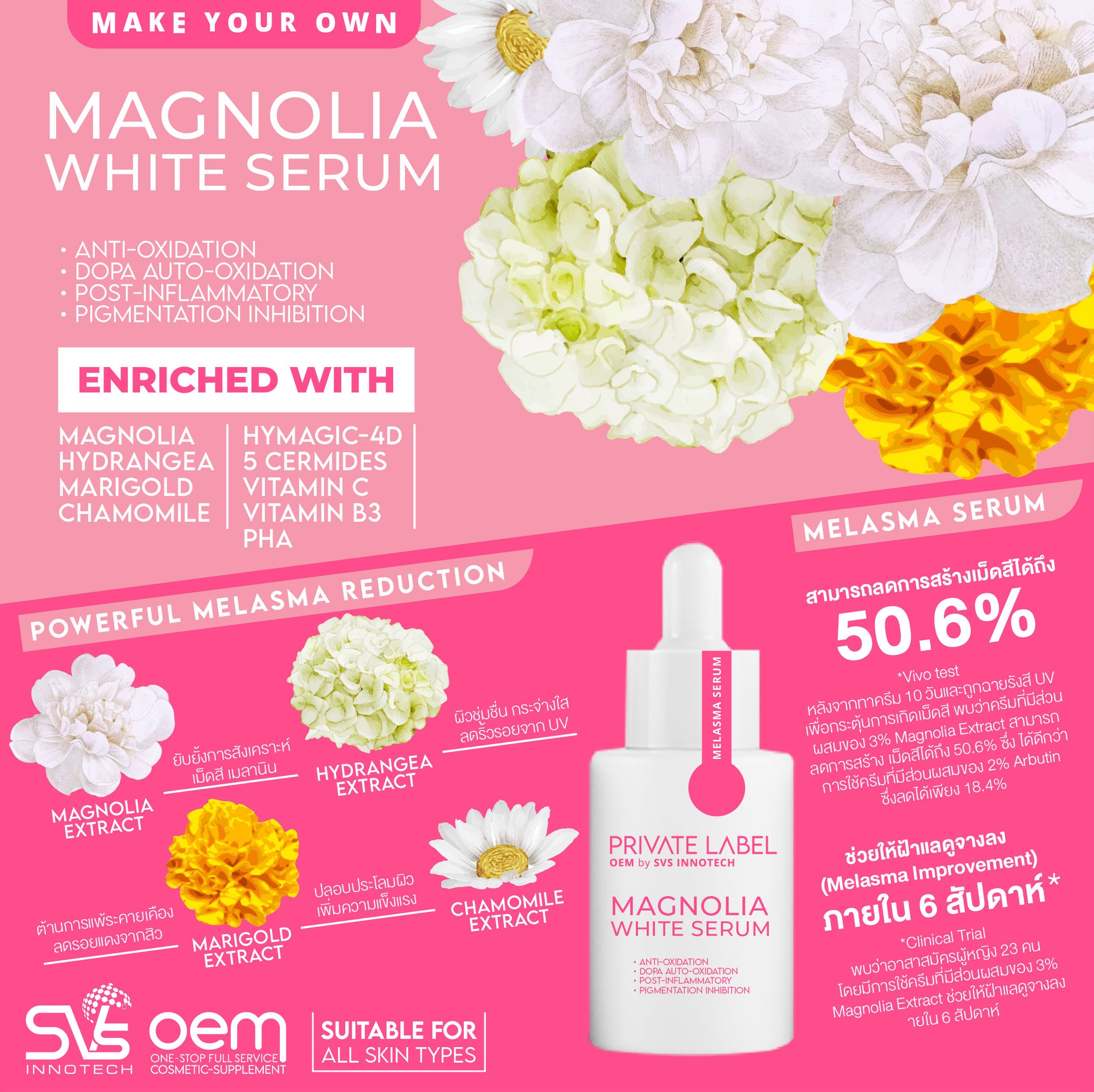 ทีมงานของเรายินดีสร้างสรรค์ผลิตภัณฑ์ความงามและสุขภาพทุกประเภทตามคอนเซปต์ของแบรนด์ เพื่อตอบสนองความต้องการของผู้ประกอบการที่ต้องการเริ่มต้นธุรกิจ ด้วยอัตราค่าบริการที่ยืดหยุ่นและปริมาณการผลิตที่เหมาะสม ทำให้การเริ่มต้นเป็นเรื่องง่ายกว่าที่เคย